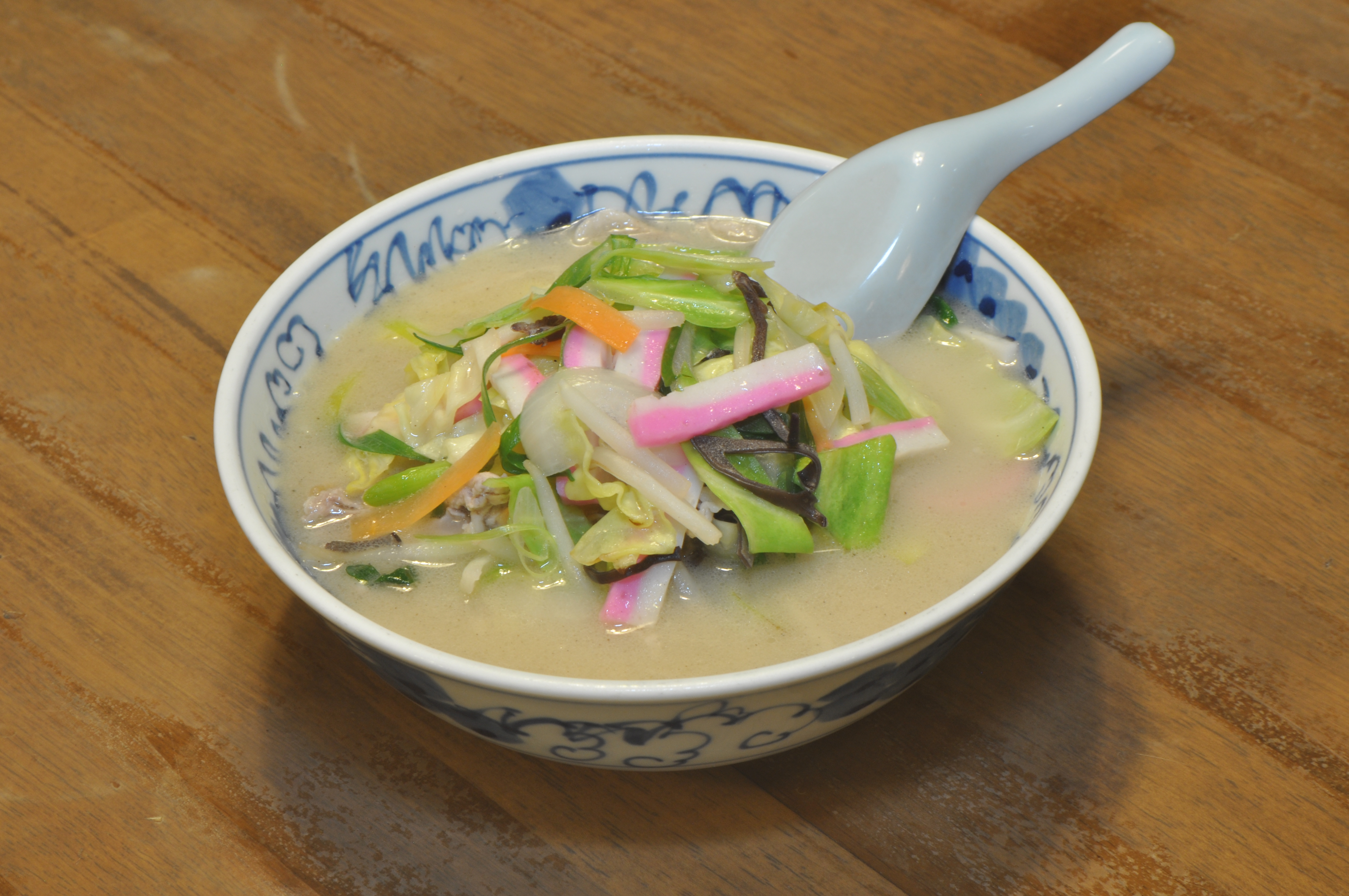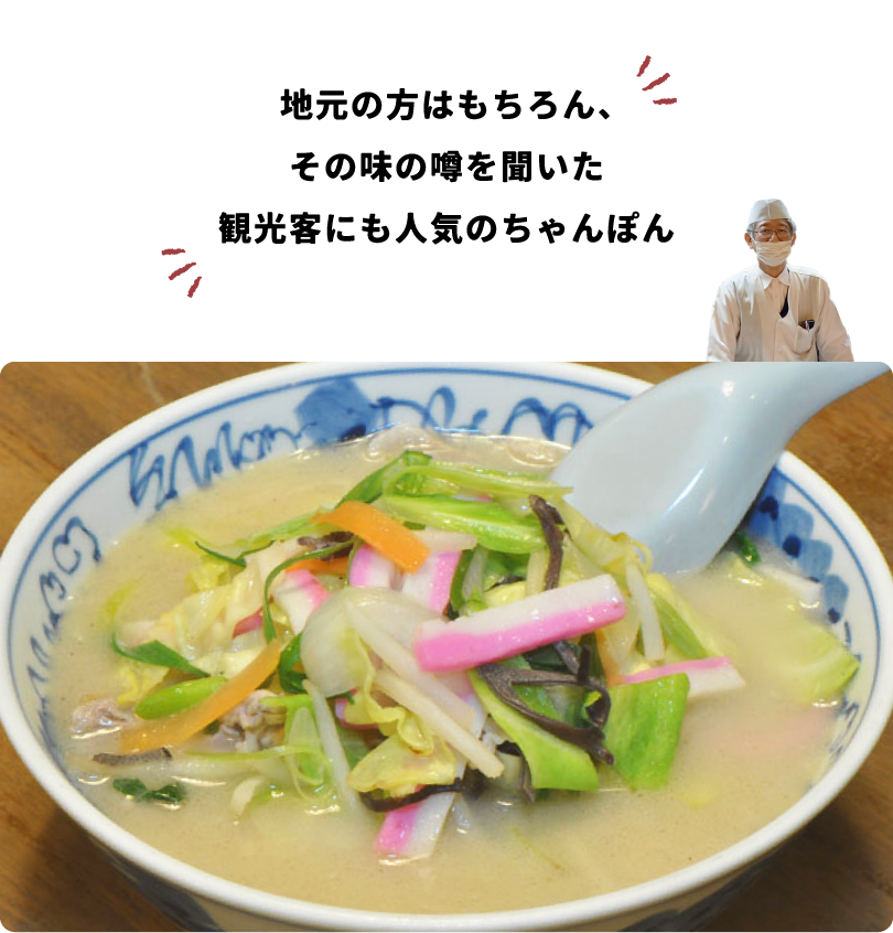 ちゃんぽんはよく出るメニューで創業後間もない頃からあります。基本的な作り方や材料は変わっていません。例えばスープは「若楠ポーク」の頭骨で取りますが、昔より丁寧に、臭みが出ないような研究をしています。あっさりしたスープの中にコクが感じられるので、「鶏がらスープ?」と言われることもありますね。これに地元の野菜をたっぷり使用しています。ランチタイムにはお弁当+ちゃんぽんというメニューもあります。そしてお客様の要望に応じて「半ちゃんぽん」も作りました。普通会席料理の最後はご飯になると思いますが、うちではちゃんぽんを出す事もあります。そういうコース料理も人気ですね。ちゃんぽん以外には、おまかせ会席も人気ですが、今はコロナの影響でお休みしている状況です。予約があれば準備します。また有明海の魚を使用した郷土料理も楽しめます。